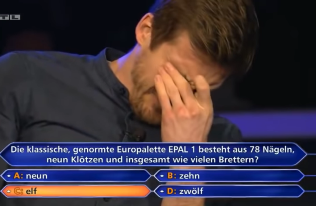„die klassische, genormte europalette epal 1 besteht aus 78 nägeln, neun klötzen und insgesamt wie vielen brettern? September 1999 ist wer wird millionär? erstmals im deutschen fernsehen zu sehen gewesen. Auf die millionenfrage die klassische, genormte europalette epal 1 besteht aus 78 nägeln, neun klötzen und insgesamt wie vielen brettern. September 1999 vom privatsender rtl ausgestrahlt und von günther jauch moderiert. Manuel, du bist heute abend in einer der bekanntesten quizshows der welt zu gast.